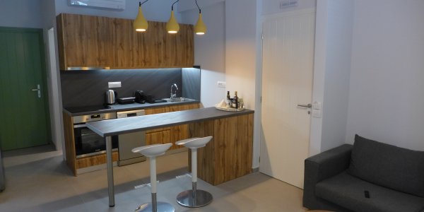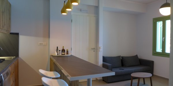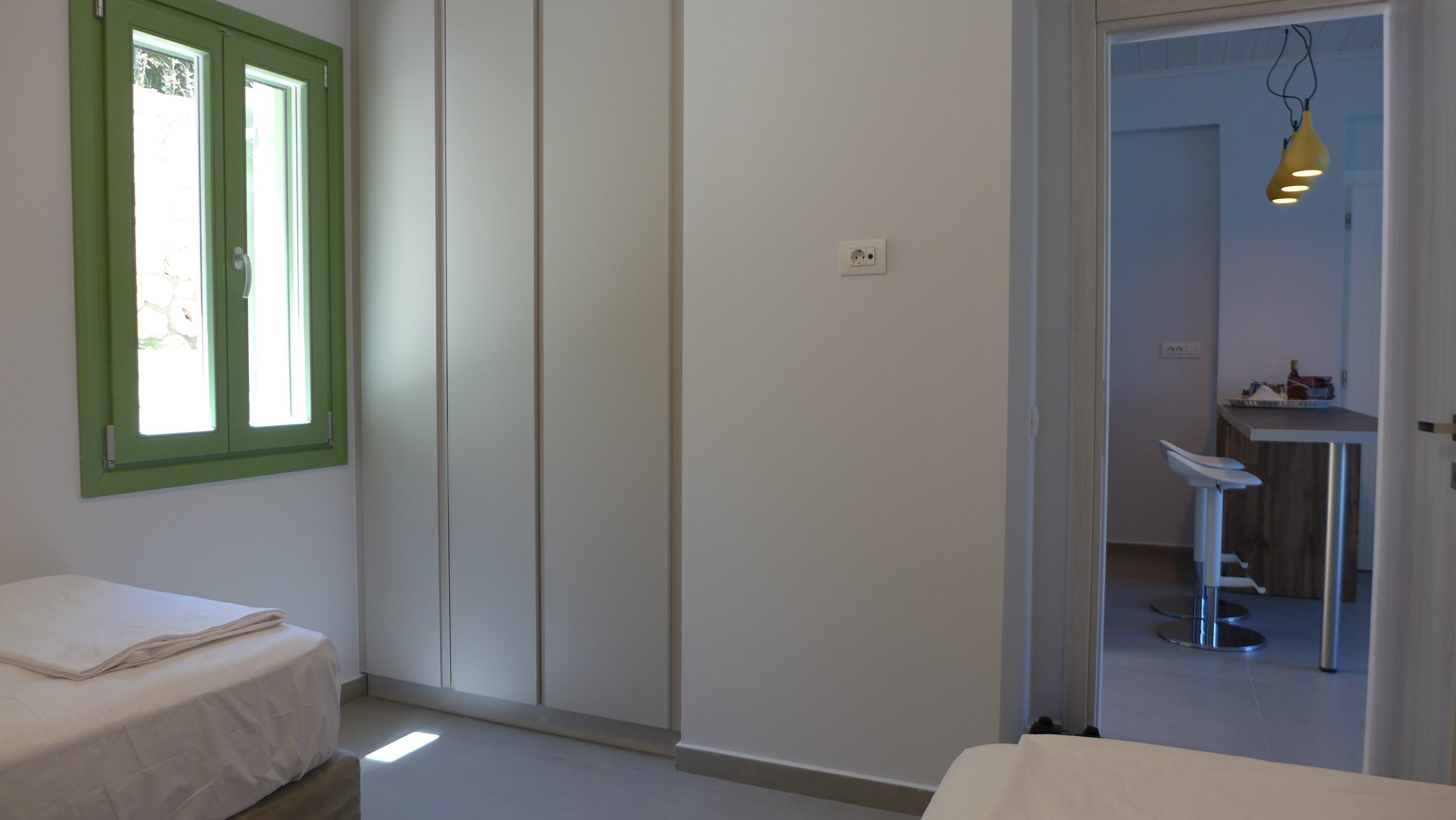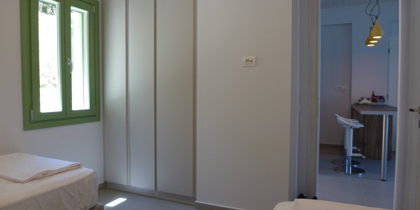 Two bedroom apartment, approx. @@@ m2, on the ground floor: bedroom 1 with double bed and see view; bedroom 2 with two single beds, that can be combined to a double bed; Living room with sofa bed (sleeps one person), smart TV, open space, & fully equipped kitchen: Stove, Microwave, Dishwasher, refrigerator, Nespresso; bathroom with shower; terrace in front with sea view, pool view, and table for 6; Terrace in the back. Hair dryer, safe box.